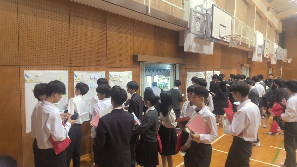 10月27日(月)6限に1年生MT発表会を行いました。1年生は6月下旬からNIE(Newspaper In Education)を取り入れ、各自が関心を持った新聞記事から、時事問題の解決策を探る「NIE de 問題解決!」という探究活動に取り組んできました。