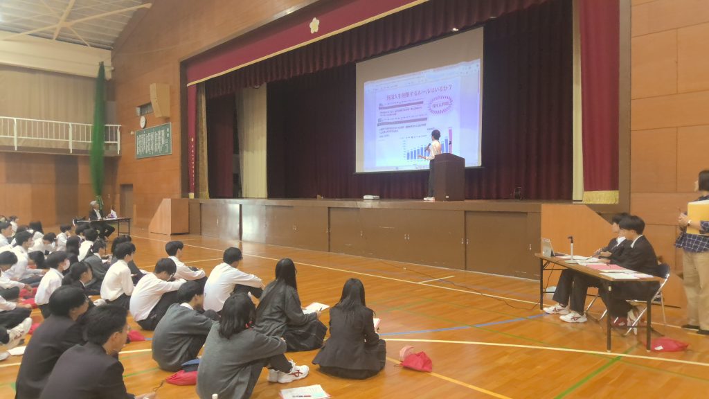 この日は各クラスの代表に選ばれた7名がプレゼンテーションを行いました。1年生としては初めての学年発表会でしたが、発表者の深い考察や工夫を凝らしたレベルの高いプレゼンに大きな拍手が送られました。この日の様子は中日新聞10月28日朝刊にも掲載されています。こちらもぜひご覧ください。