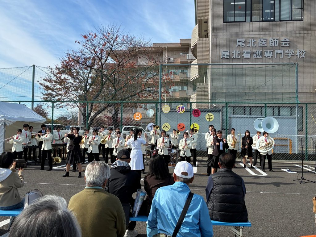 11月23日(日)に尾北看護専門学校の「創立30周年記念イベント」で演奏させていただきました。インフルエンザにより、残念ながら参加できなかった部員も多かったのですが、ポップコーン、綿菓子、キッチンカー、バザーのほか、健康チェックやドクターカーの展示もあり、楽しい時間がもてました。また、ナース服の試着コーナーもあり、学生指揮者の生徒は、写真のようにナース姿のままで指揮をしました。