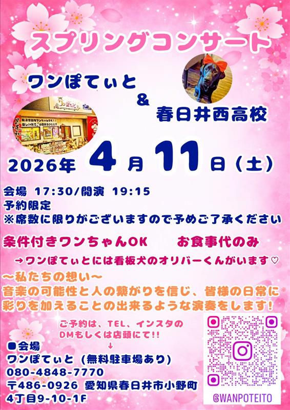 お知らせ 探究活動(MT)でカフェレストランと提携し音楽イベントを開催します。 2026年3月27日 本校の探究活動(MT)の一環として、新3年生の生徒が4月11日(土)春日井・勝川にあるカフェレストラン「ワンぽてぃと」さんと提携し、音楽のイベントを開催します。